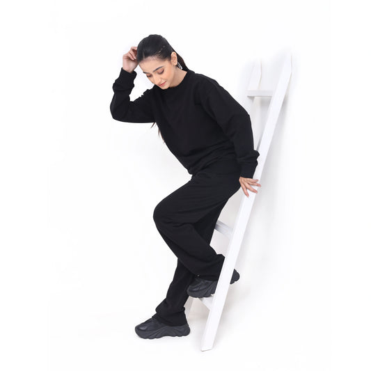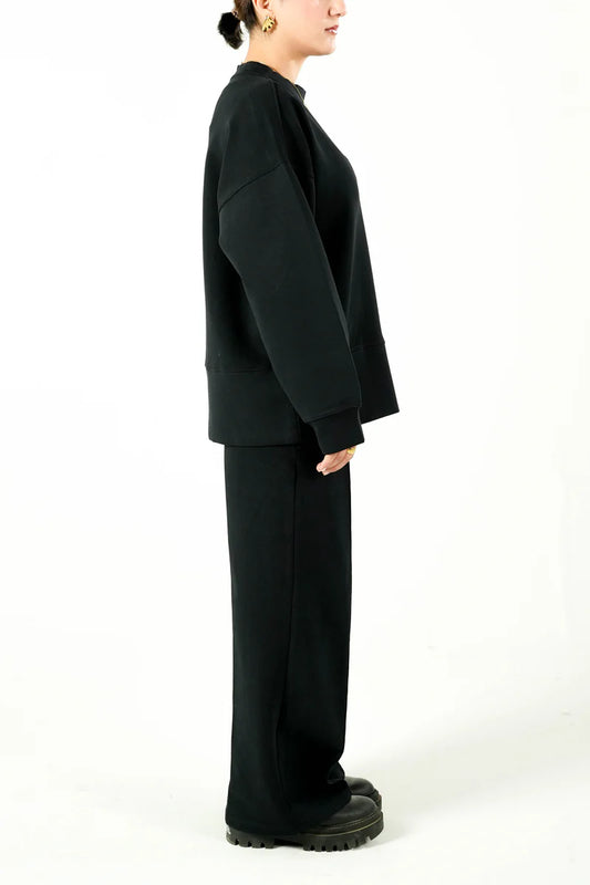 Drop Shoulder Sweatshirt and Flared Trouser Set - Black